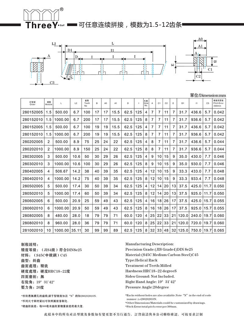 銑削(精銑)齒條模數(shù):M1/M1.25/M1.5/M2/M3/M4/M5/M6/M8/M10